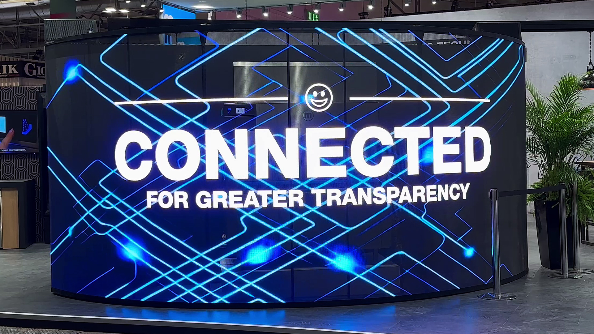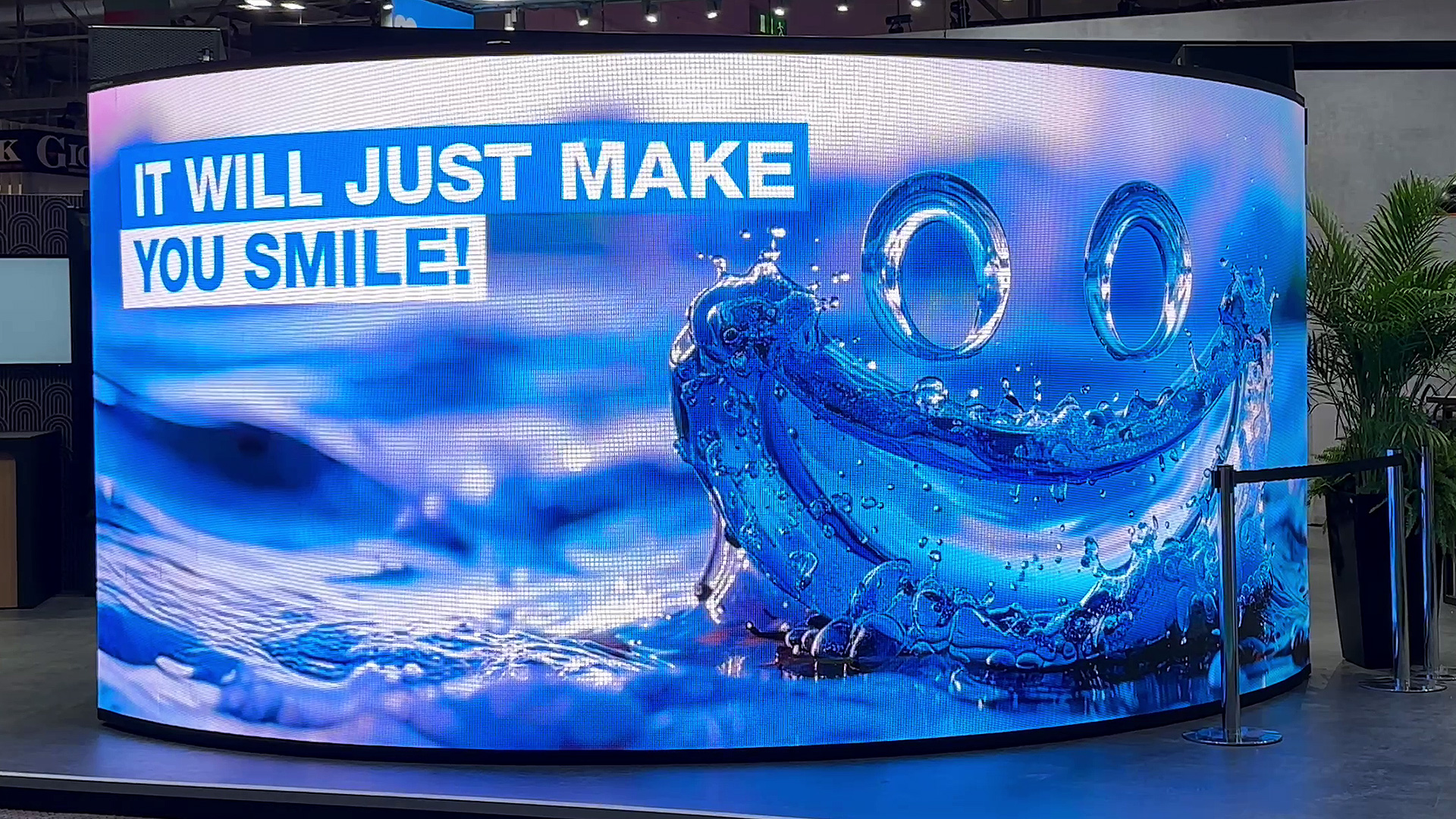 Unser LED-Mesh überzeugt mit hochauflösender Videoqualität und extremer Helligkeit. Diese als Viertelkreis gebogene Installation hat eine Breite von 6m und eine Höhe von 2,4m.