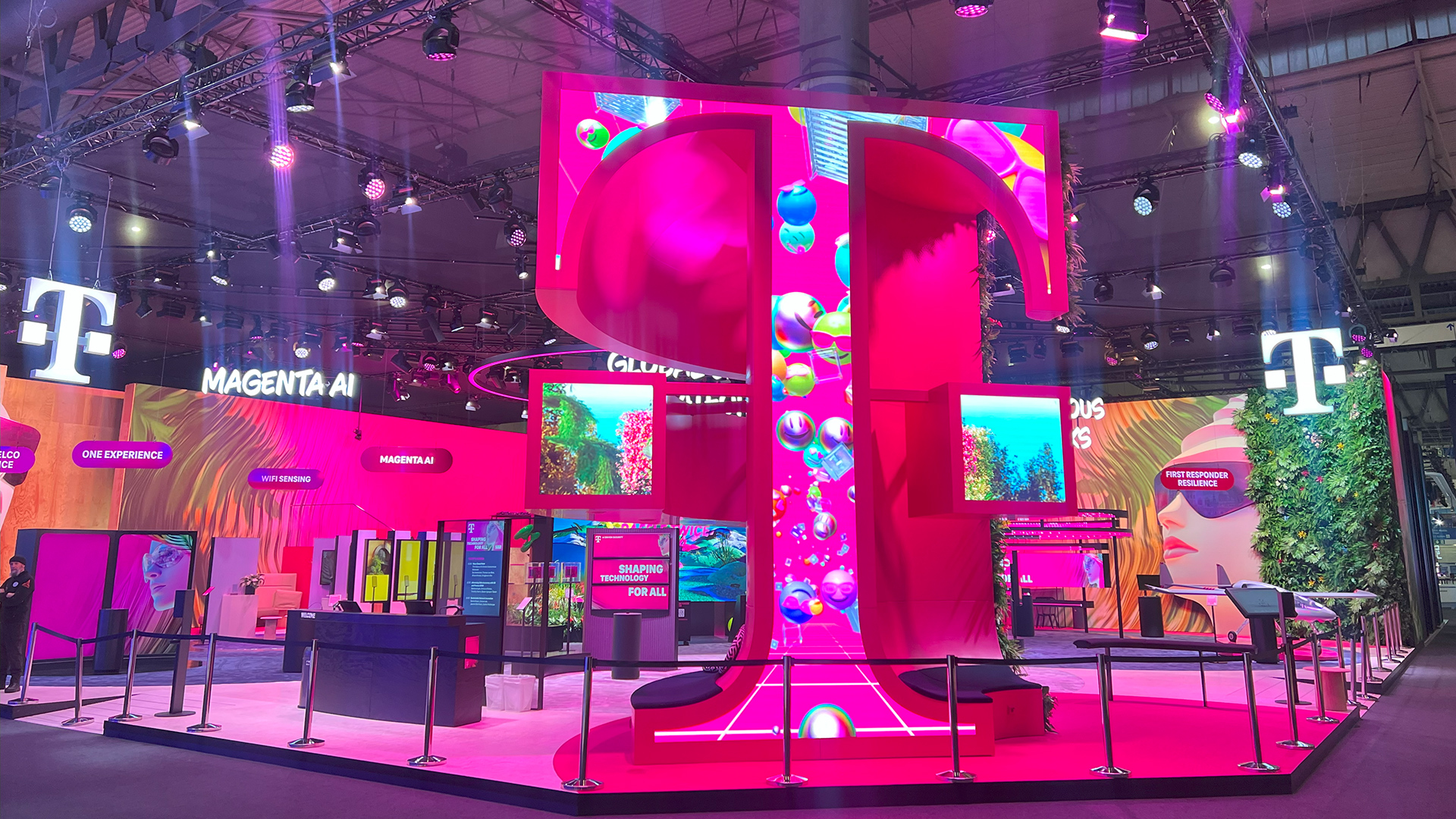 Aus mehr als 320 speziell gefertigten Video-LED-Modulen entstand dieser 6m hohe Eye-Catcher auf dem Mobile World Congress in Barcelona.